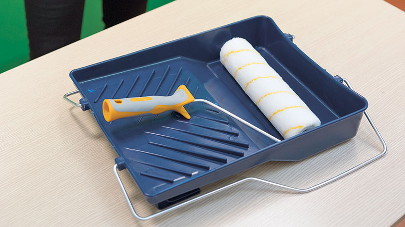 - Leg al het nodige materiaal klaar alvorens te beginnen: verfrol, borstel voor de randen, verfbak en -rooster, roerstaaf, eventueel een haak om de verfpot op te hangen en doeken.