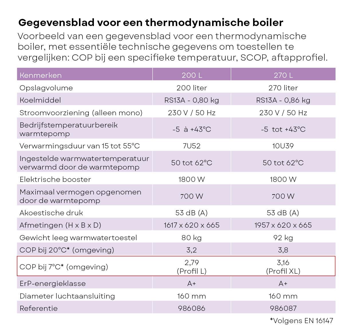 Hier kun je zien dat de COP bij 7°C met een L-profiel van 200 liter 2,79 is. Of dat de COP bij 7°C met een XL-profiel van 270 liter 3,16 is.