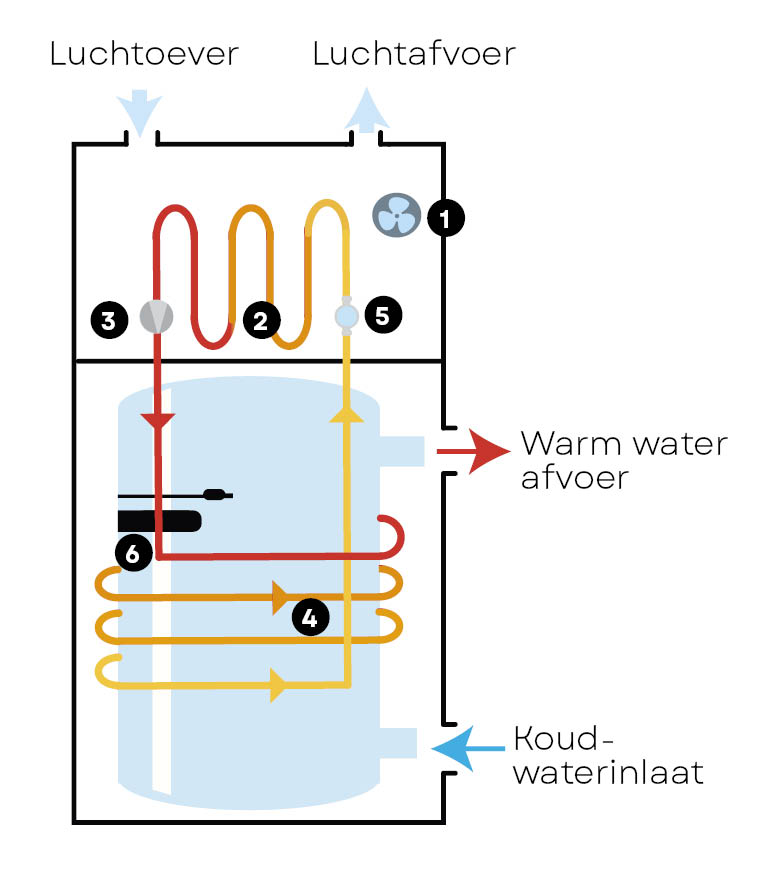 Het principe achter een warmtepompboiler is eenvoudig: hij onttrekt warmte uit de lucht en gebruikt die om water op te warmen met een warmtepomp die boven in het warmwaterreservoir is ingebouwd.